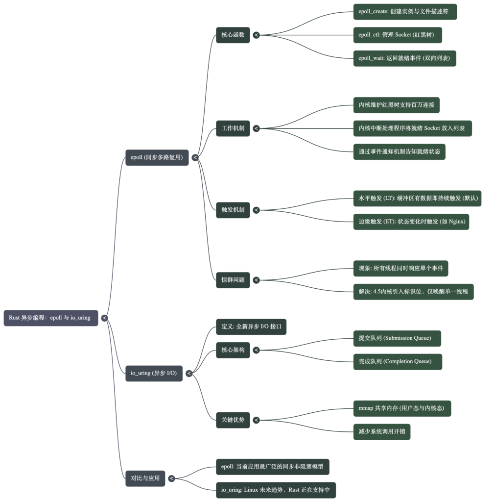 底层支撑:虽然目前 Rust 异步编程中使用最广泛的底层模型仍然是 epoll,但 Rust 社区正在积极推进对 io_uring 的支持。